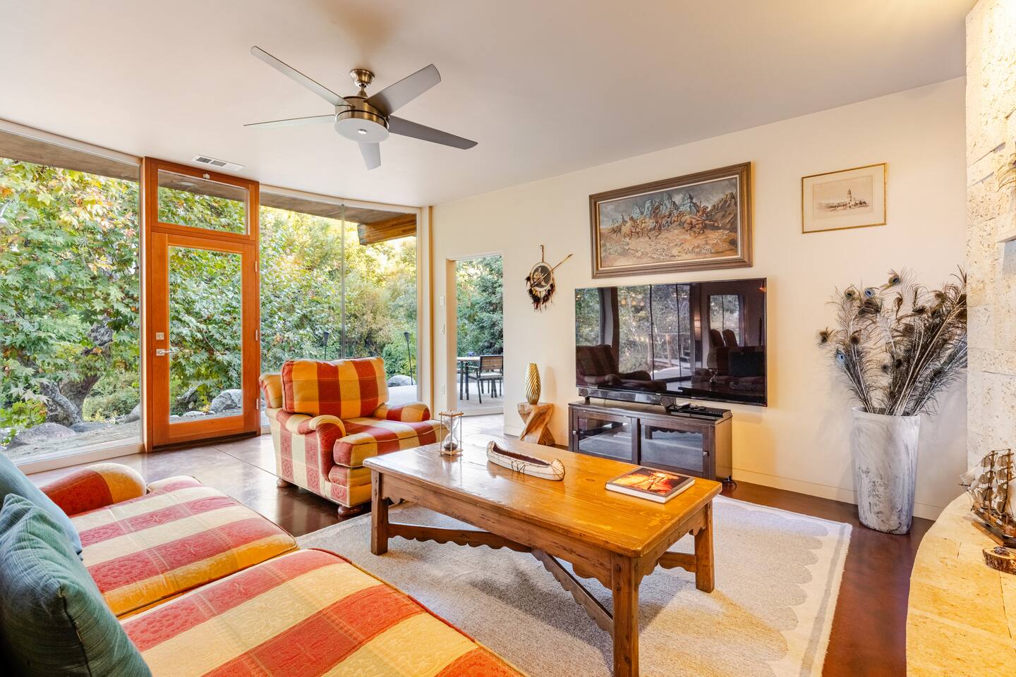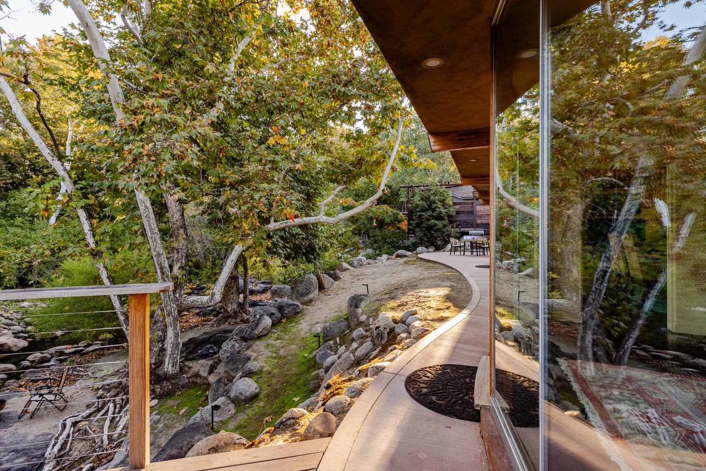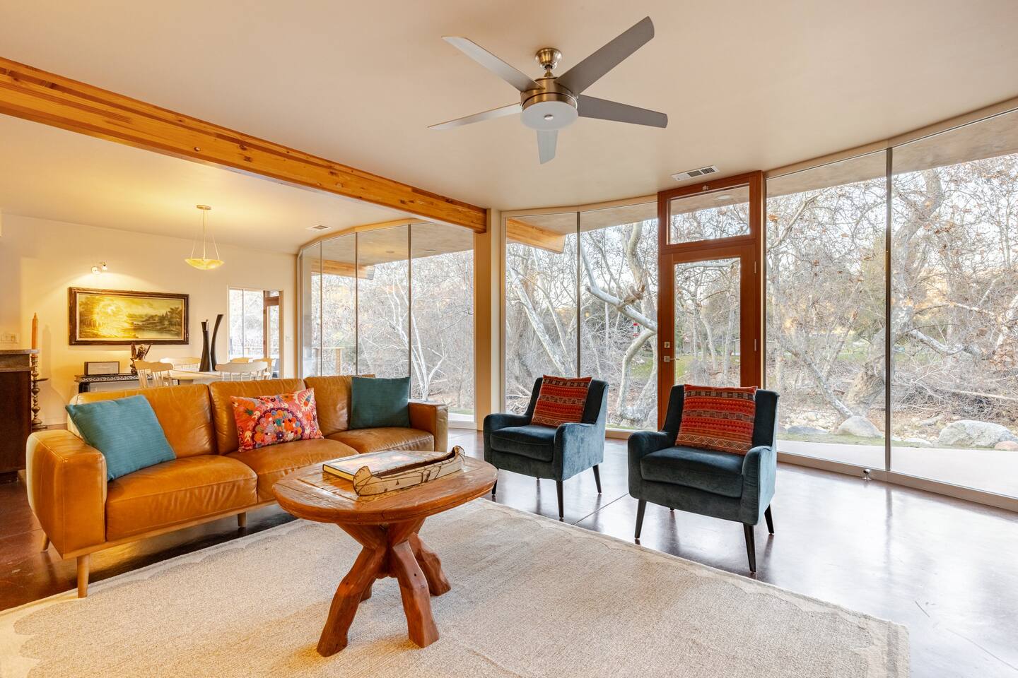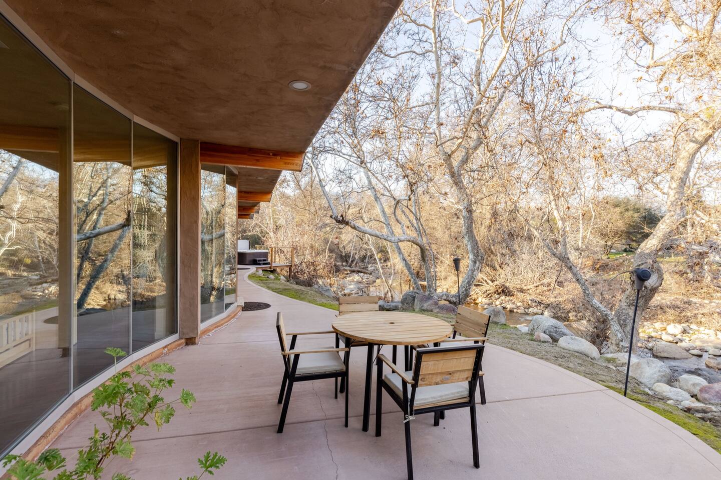 Welcome to a Modern Desert Architectural Wonder, set in Cherokee Oaks, Three Rivers' premier neighborhood. Nestled by the sacred South Fork, this property combines luxury and natural beauty for a unique getaway experience. Key Features: Stunning Design: Enjoy the spaciousness given by glass walls that frame breathtaking river views, complemented by unique architecture likened to a modern fort. Riverside Relaxation: Unwind in a hot tub almost touching the river, with private access to beautiful river beaches, perfect for swimming and picnicking. Location: Just 10 minutes away from Sequoia National Park entrance, and 30 minutes to Kings Canyon National Park. State-of-the-art Amenities: Fully equipped chef’s kitchen with top-tier appliances Luxurious accommodations enriched by original artwork and indigenous Yokut Tribe markings Floor-to-ceiling windows inviting nature inside Private gym Fire pit and picnic areas to enjoy al fresco dining Bird sanctuaries for nature enthusiasts Laundry facilities Curated Experience: Developed by G&G, recognized in Airbnb Magazine & Condé Nast Travel, ensuring attention to every detail for a boutique stay. Guest Experience: Bask in the serenity and elegance of this architectural masterpiece while exploring nearby parks and immersing yourself in the natural splendor. Book your stay now to embrace the seamless blend of modern luxury and nature's untouched beauty. A sanctuary awaits, ready to give you memories that blend the contemporary charm with nature’s timeless wonders, inviting every guest to their perfect escape.